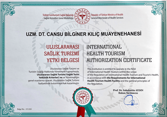 Uzman Dt. Cansu Bilginer Kılıç Muayenehanesi Uluslararası Sağlık Turizmi ve Turistin Sağlığı Hakkında Yönetmelik kapsamında, Uluslararası Sağlık Turizmi Sağlık Tesisi Yetkinlik Kriterleri’ne ve Yönetmeliğin genel esaslarına uyarak, Uluslararası Sağlık Turizmi faaliyetinde bulunmaya hak kazanmıştır.